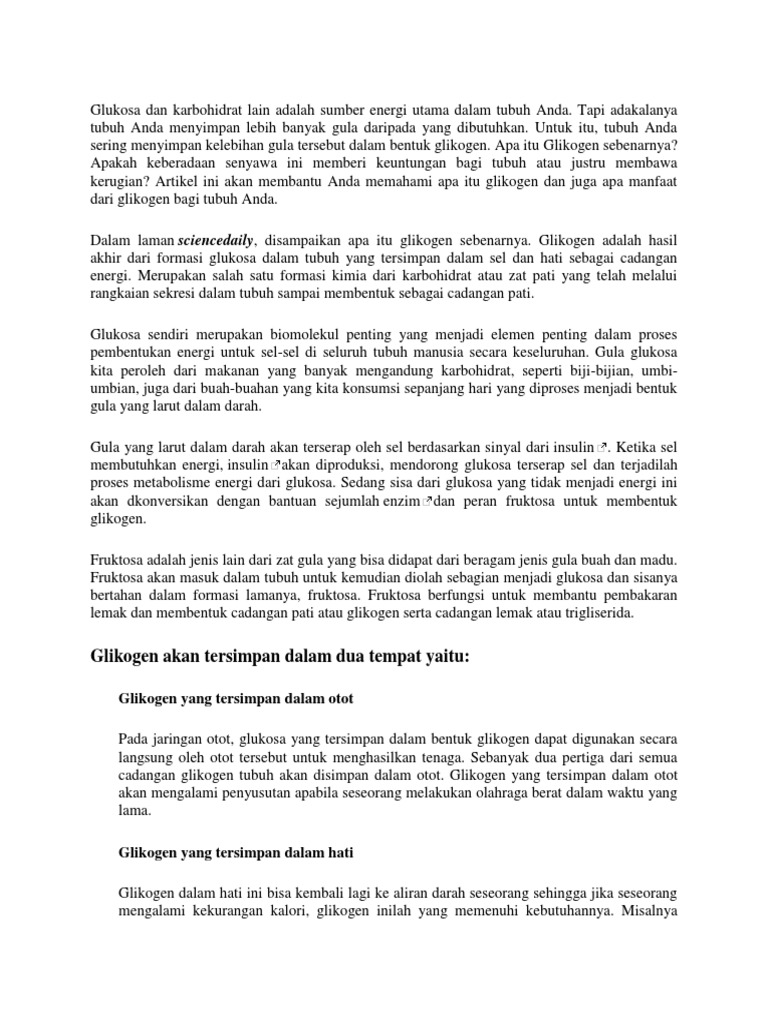 Namun, apabila kesediaan bahan bakar berupa glikogen dan lemak dalam tubuh telah habis, maka tubuh akan membakar otot guna mendapatkan energi. Dibawah ini merupakan 3 pembagian karbohidrat berdasarkan susunan. Glikogen adalah energi cadangan yang penting diketahui. 209 ilmu pengetahuan alam 1. Tanaman menyimpan cadangan makanan dalam bentuk tepung (starch) yang disimpan dalam plastid. 2) pemberi rasa manis pada makanan karbohidrat memberi rasa manis pada makanan, khususnya mono dan disakarida. Karbohidrat dalam sel tubuh disimpan dalam hati dan jaringan otot dalam bentuk glikogen. Sangatlah penting untuk menjaga agar simpanan glikogen tersebut tetap terisi ketika kita akan melakukan aktivitas yang membutuhkan energi dalam jumlah besar, seperti latihan atau olahraga yang lama atau membutuhkan glikogen untuk waktu yang lama. Reaksi pembentukan dan pemecahan polimer, reaksi hirolisis, reaksi.