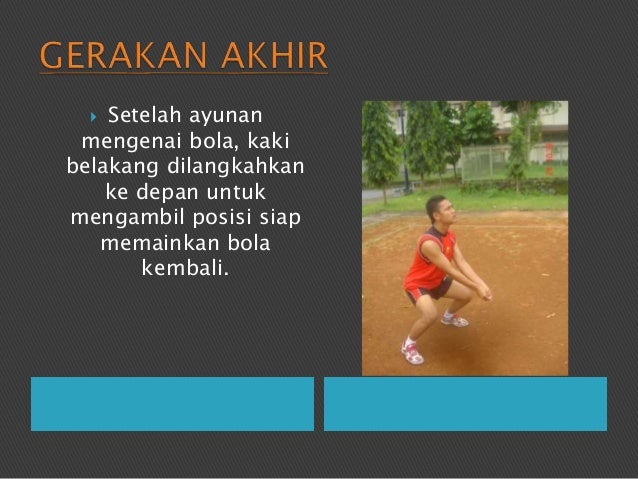 Posisi kedua telapak kaki sejajar membentuk sudut sekitar 60 derajat. Pukulan dengan cara merendahkan posisi tubuh lalu. Posisi telapak kaki depan lurus dan telapak kaki belakang membentuk sudut ± 60 derajat. 1) kaki kanan di depan dan berat badan tertumpu pada kaki kanan. B) begitu bola datang, bet digerakkan ke atas dengan bantuan gerakan siku dari 160 derajat menjadi 90 derajat kemudian bola dipukul pada saat bola mencapai titik tertinggi pantulan. Membentuk sudut 60 derajat b. Sikap pasang dibagi menjadi dua yaitu : Pandangan ditujukan pada arah datangnya bola. Posisi kedua telapak kaki serong membentuk sudut + 30.