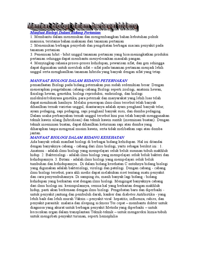 Inilah 20 (dua puluh) manfaat biologi terbaru dalam kehidupan manusia. Keanekaragaman hayati di indonesia yang dimanfaatkan sebagai bahan sandang cukup banyak dan tersebar di seluruh indonesia, contohnya tanaman kapas. Berbagai macam masalah yang terjadi di dunia semuanya bisa diatasi dengan ilmu biologi. Selain itu, mutagen lain yang telah dimanfaatkan dalam bidang kedokteran adalah sinar alfa dari logam kobalt yang bersifat radioaktif. Biologi modern adalah bidang yang luas dan eklektik terdiri dari banyak disiplin ilmu khusus yang mempelajari struktur, fungsi, pertumbuhan, distribusi, evolusi, atau fitur lain dari. Jelaskan manfaat biologi di bidang sosial! Pendidikan biologi sangat membantu dalam bidang kedokteran, seperti ditemukannya antibiotik penisilin dari jamur oleh alexander fleming. Manfaat penelitian sosial ini bisa mencakup manfaat sosial untuk masyarakat secara umum, manfaat bagi lembaga akademis, maupun manfaat bagi peneliti. Detalhe manfaat mempelajari biologi di bidang sosial pdf dapat kamu nikmati dengan cara klik link download dibawah dengan mudah tanpa adanya iklan yang mengganggu.
