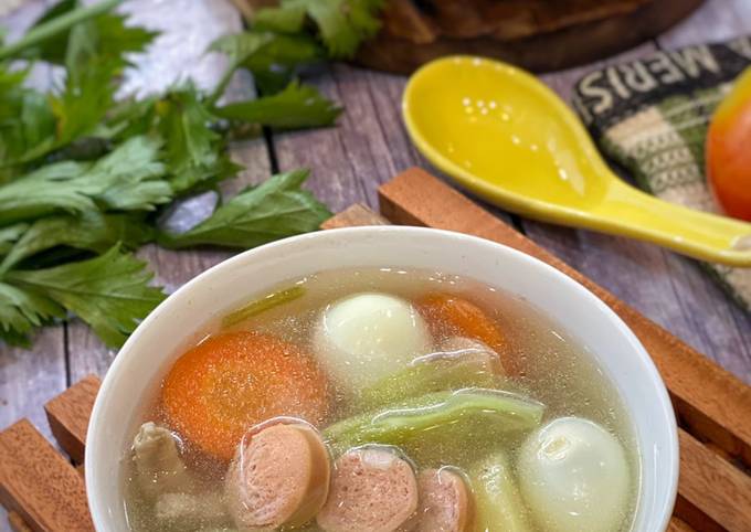 Membuat Sup Telur. Melansir dari healthline, telur sangat kaya akan vitamin b12 dan selenium. Kamu pun bisa menambahkan bahan protein olahan daging seperti sosis atau bakso. Pecahkan telur dalam mangkuk, kocok asal. Masukkan telur puyuh dan wortel. Tumis bawang putih sampai harum, masukkan wortel. Diamkan beberapa saat aduk rata. 2 butir telur ayam kampung. Potong sosis dengan ketebalan sesuai selera. Cuci bersih daun bawang dan seledri. Siangi kapri dan potong wortel berbentuk bulat. Buat kamu yang suka bingung ingin menyajikan menu apa untuk sarapan atau makan siang, bisa mencoba sup telur ini. Kalau bosan sup ayam kamu bisa membuat sup daging sapi. Mengonsumsi jagung atau produk jagung bisa membantu menjaga kesehatan usus, dibanding dengan makanan olahan dari tepung. Buatlah tampilan telur “parut” dengan mengucurkan telur secara perlahan ke dalam sup melalui garpu atau sumpit sambil terus mengaduk sup dengan tangan lainnya. Bisa memakai daging ayam, daging sapi atau seafood segar.